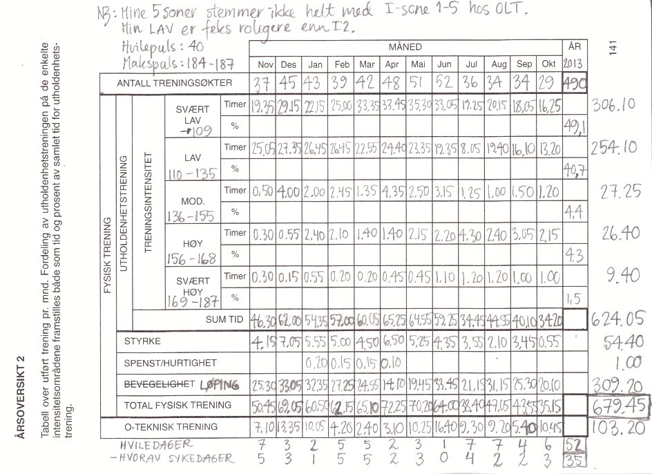 Dette er det jeg har drevet med i år. Mange gode minner, oppsummert på en tørr A5-side. En rekke veldig morsomme uker og noen helt elendige, takket være sykdom og skader. Planla å trene ca 700 timer. Det ble noe der omkring til tross for ny rekord i hviledager, som kan forklares med en (for meg) spinnvill rekord i sykedager. Legger noe av skylden på sønnen min, som startet i barnehage høsten 2012 og har såkalt styrket immunforsvaret sitt der.