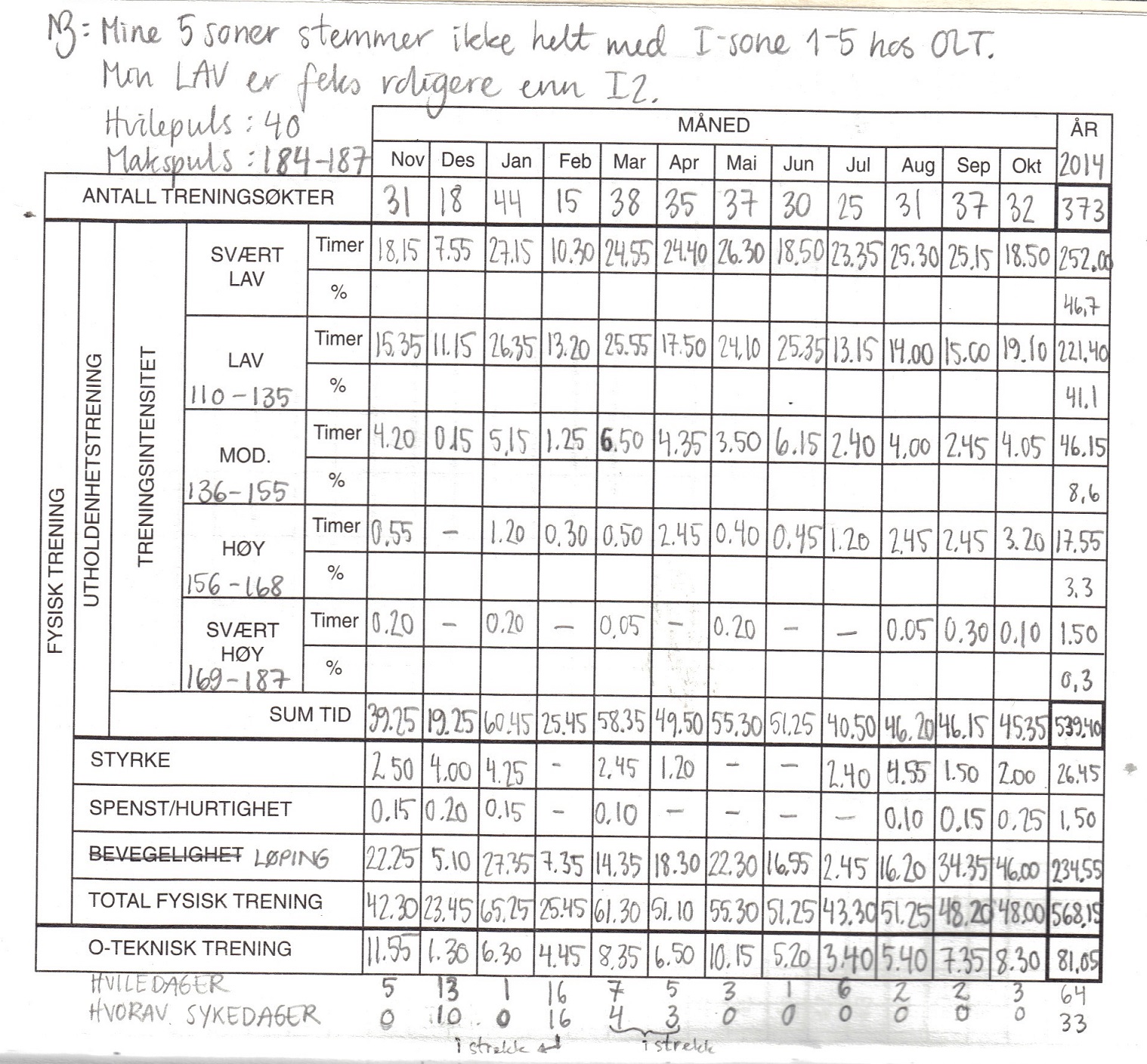 Her er tabellen som oppsummerer treningsåret 2014: En mellomsesong for meg, i og med at jeg fikk barn i juli. Treningsåret mitt går fra 1.november til 31.oktober, men tabellen kommer visst først nå.